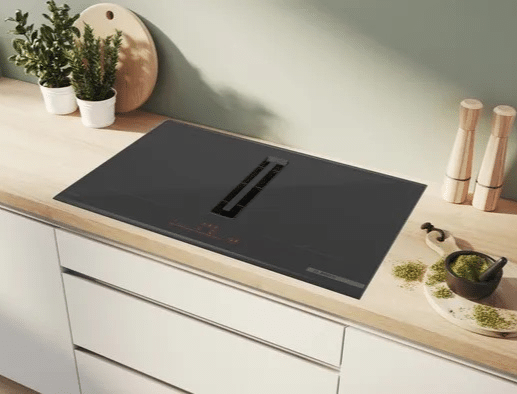 De geïntegreerde afzuiging zit in het midden van de kookplaat. Hierdoor heb je geen afzuigkap meer nodig. Dat geeft meer zicht en een open, ruimtelijk gevoel in je keuken.
